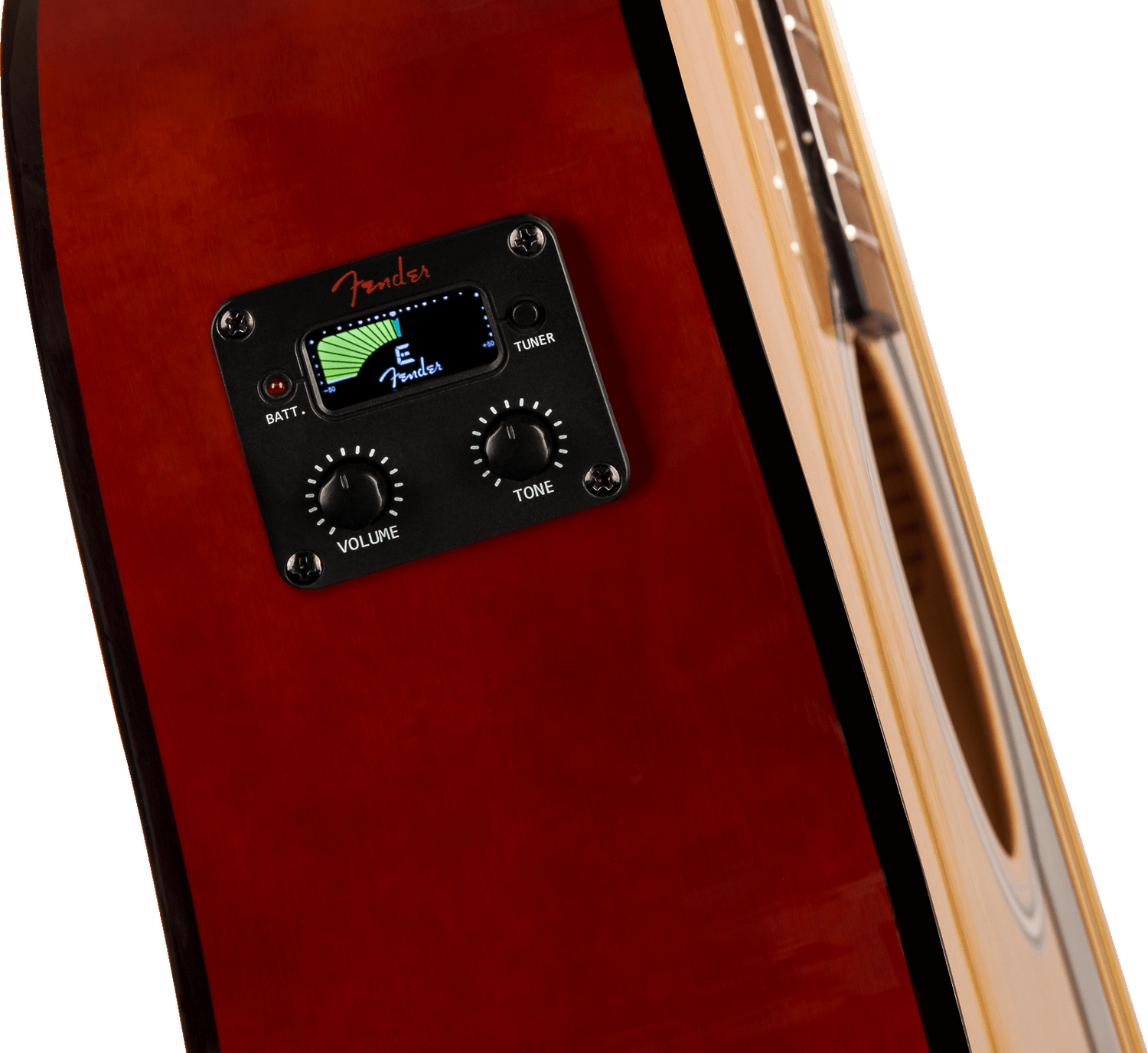 The single-cutaway FA-125CE combines Fender tone and style with our FE-A2 electronics for a guitar that was made to take the stage. Quality laminate construction with a modern Fender 3+3 headstock and Viking bridge create a great-sounding instrument that's easy to play. Beginners and developing players will appreciate the nato neck that gives the guitar a lively tone and smooth, easy playing feel.