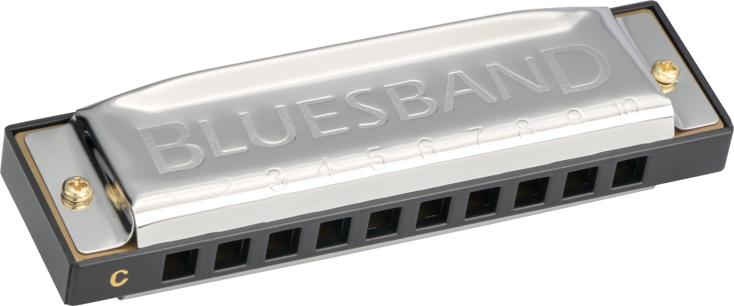 This great Hohner Bluesband harmonica starter kit gives you seven different key harmonicas (G, A, Bb, C,D,E,F) packaged in a padded hard shell carrying case. Harmonica features Brass Reeds, Plastic body and Stainless Steel Covers.
