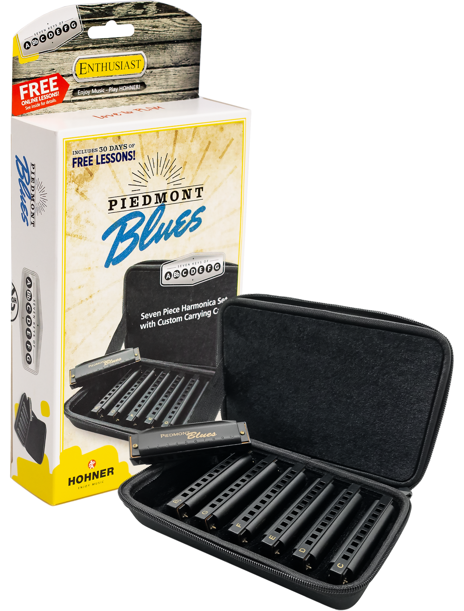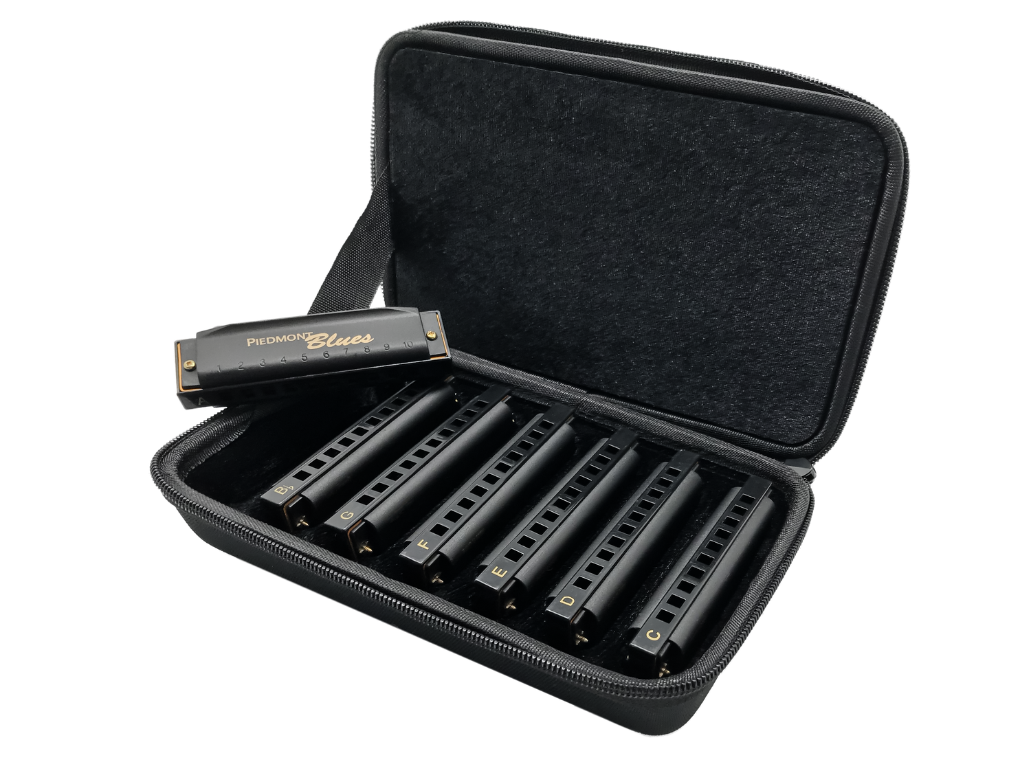 With an attractive dark finish and included zippered case, Hohner's Piedmont Blues set is the perfect seven-piece starter set for those serious about taking up the harp. Seven great blues harps in an eye-catching matte black finish with gold trim.