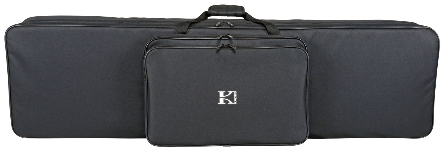 The Kaces Xpress Series keyboard bag features a water-resistant, luggage-grade, 600D polyester exterior, quilted grip handle, and dense, protective foam padding. There are two large, expandable pockets with room for a laptop or table top synth, cables, power supplies, sustain pedals, sheet music, microphones, and other accessories. Each bag has extra-strength stitching at tested stress points, silver, easy-pull zippers, and metal hardware. 55" x 14.5" x 5.5" (139.7 cm x 36.7 cm x 14 cm) fits most 88 note keyboards.