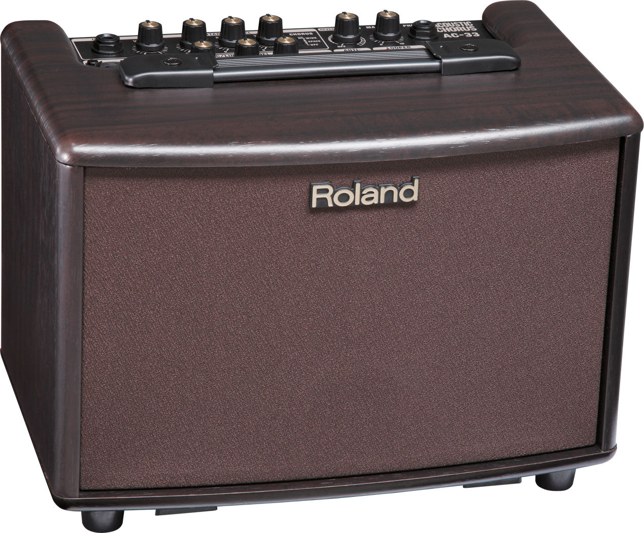 Rich, deep, stereo sound to go — introducing the AC-33, the world’s first battery-powered amp made specifically for acoustic guitar. Portable yet powerful, the AC-33 provides true stereo sound, Guitar and Mic/Line channels, custom-tailored effects, anti-feedback, and a Phrase Looper. But this amp was made to go places no amp has gone before. Thanks to its battery-power capability, the AC-33 lets you take your act anywhere: into the backwoods, onto the streets, or wherever your imagination leads you. Now the AC-33 is available with beautiful rosewood-look cabinets, offering an alternative to the standard stage-ready black finish. The attractive woodgrain styling perfectly matches the atmosphere of your living room or studio, as well as the aesthetic of your acoustic guitars. 30 watts (15W+15W) of natural, stereo acoustic sound through twin speakers; runs on AC power or eight AA batteries (accepts rechargeable NiMH types); dual-channel configuration: Guitar and Mic/Line channel